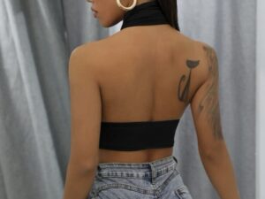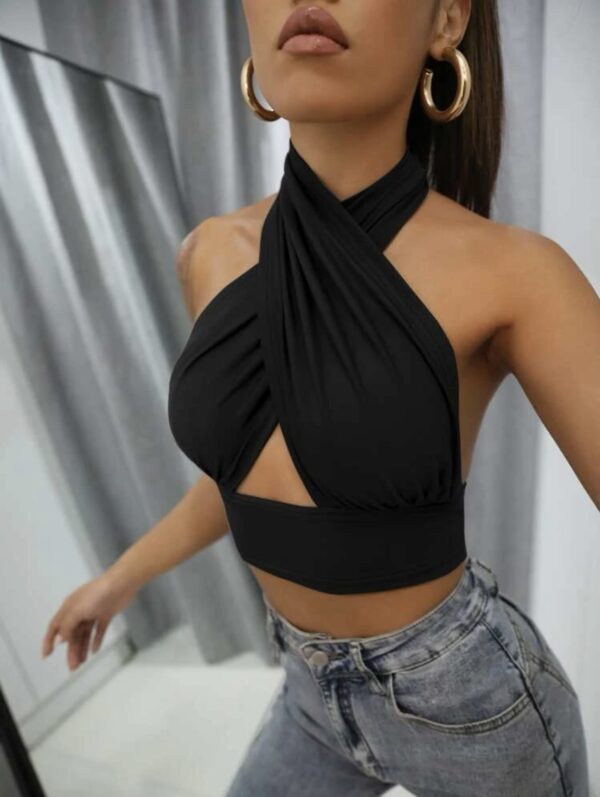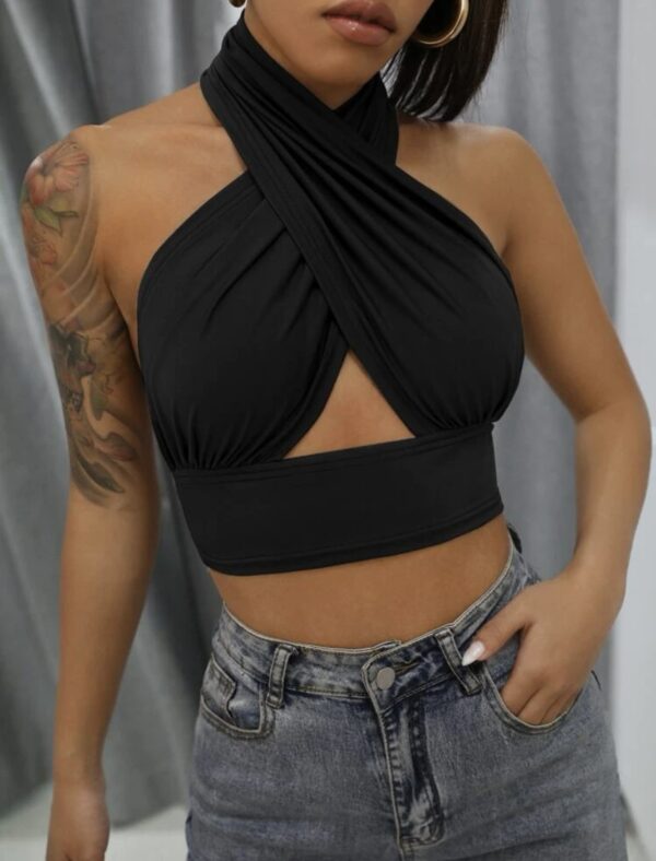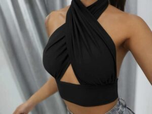 Top IMPORTADO súper elastizado cruzado con espalda al aire. Hermoso calce y súper cómodo. Viene con abertura para colocar relleno en la zona del busto. Color negro.